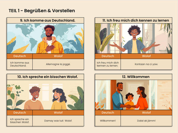 Dieses liebevoll gestaltete digitale Lernpaket hilft dir, Wolof und Deutsch im Alltag sicher und natürlich zu sprechen – Schritt für Schritt, ohne Druck.